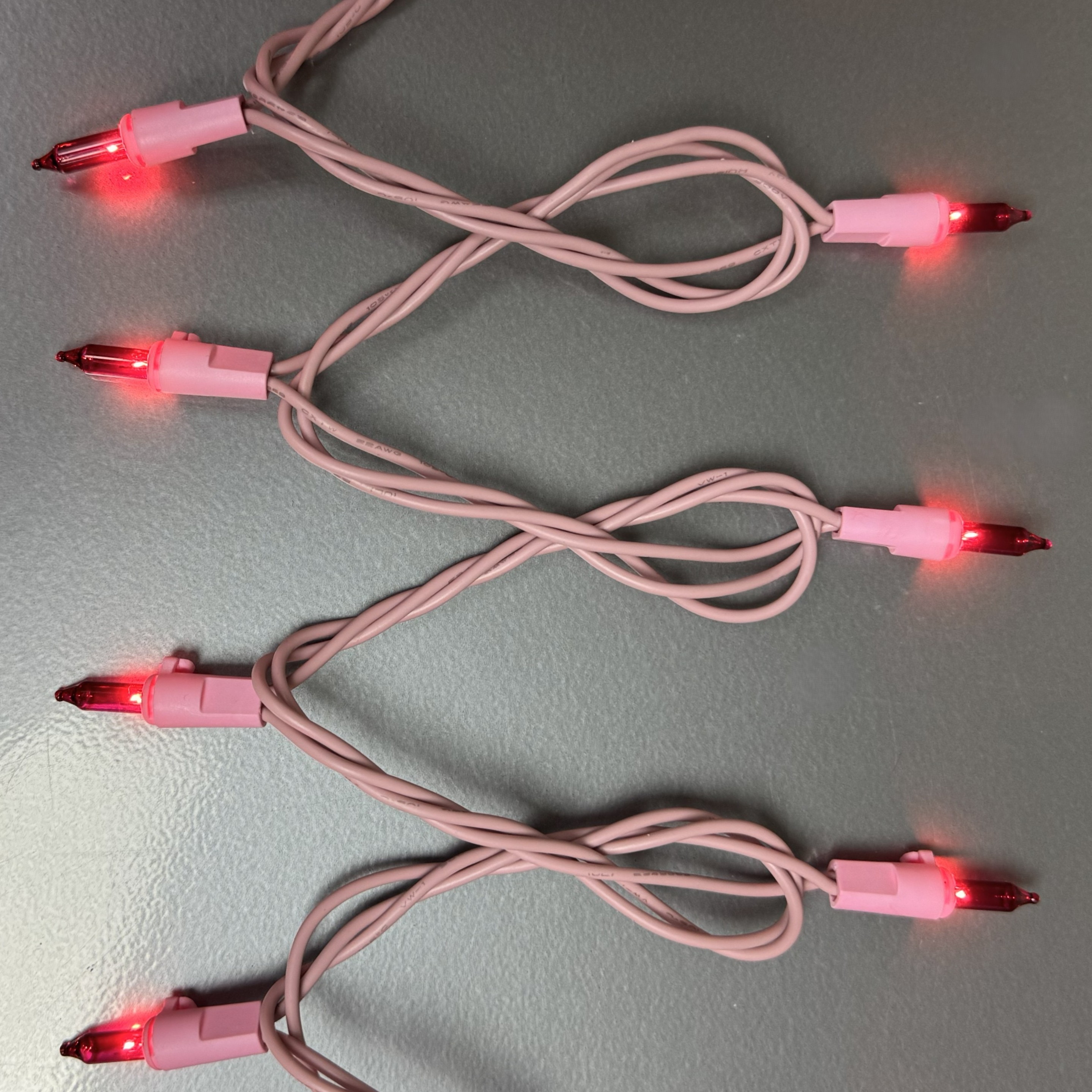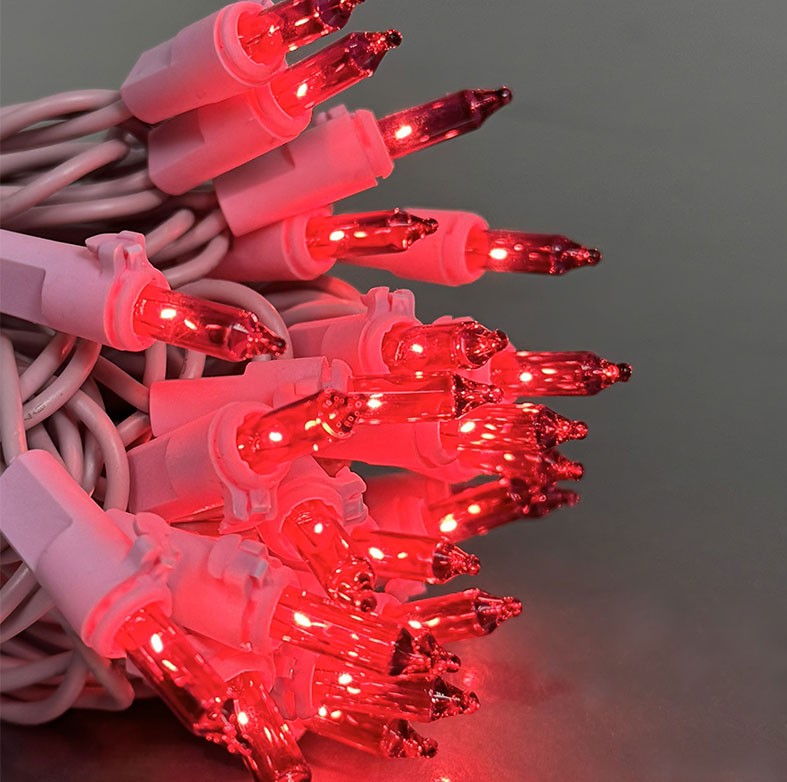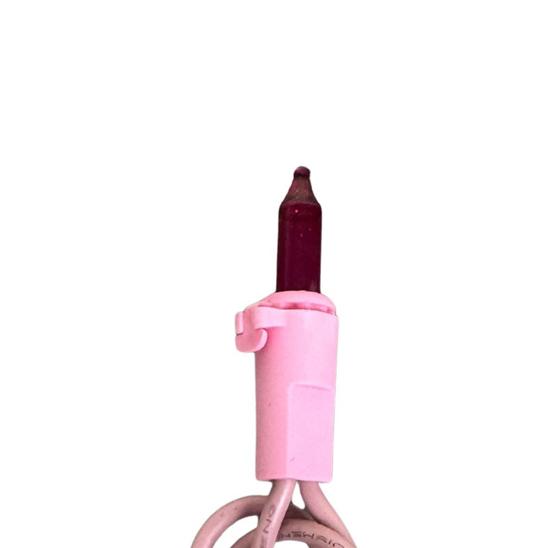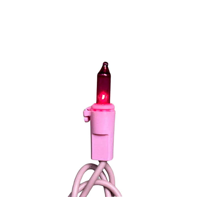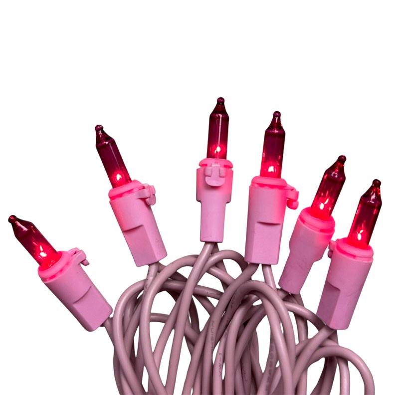 50-light pink miniature lights on an approximate 19 ft. pink cord. Hang these pink mini lights around your Christmas tree, around your staircase railing, on the mantle, or with your other decorations for a unique, bright lighting display. End-to-end connection allows you to connect up to 9 sets for a 171 ft. continuous pink strand.