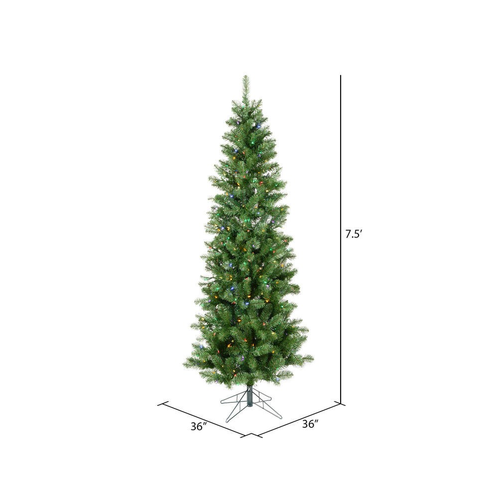 Brighten your holiday decor with the Vickerman 7.5' Salem Pencil Pine Artificial Christmas Tree (Model A103077LED). This slender tree stands 7.5'feet tall with a 36-inch width, making it ideal for areas where space is limited but festive presence is desired. It features 664 lush green PVC branch tips for a realistic, full profile and comes pre-lit with 400 multi-colored Italian Dura-Lit LED mini lights, designed to stay lit even if one bulb goes out. The metal hinged branch design ensures quick assembly and convenient storage, while the sturdy metal stand provides reliable support. This durable, energy-efficient tree brings color, charm, and easy setup to your seasonal celebrations.