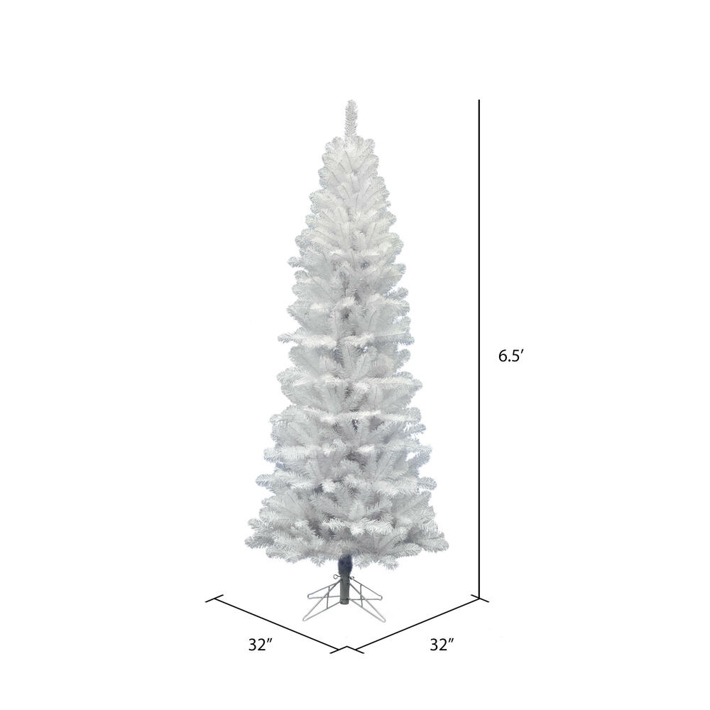 Brighten your holiday decor with the 6.5' White Salem Pencil Pine Artificial Christmas Tree (Model A103265). Featuring 493 white PVC tips and a 32" spread, this unlit tree creates a brilliant, snow-like appearance without additional flocking. Its pencil pine silhouette is ideal for small rooms, desktops, or accent displays.