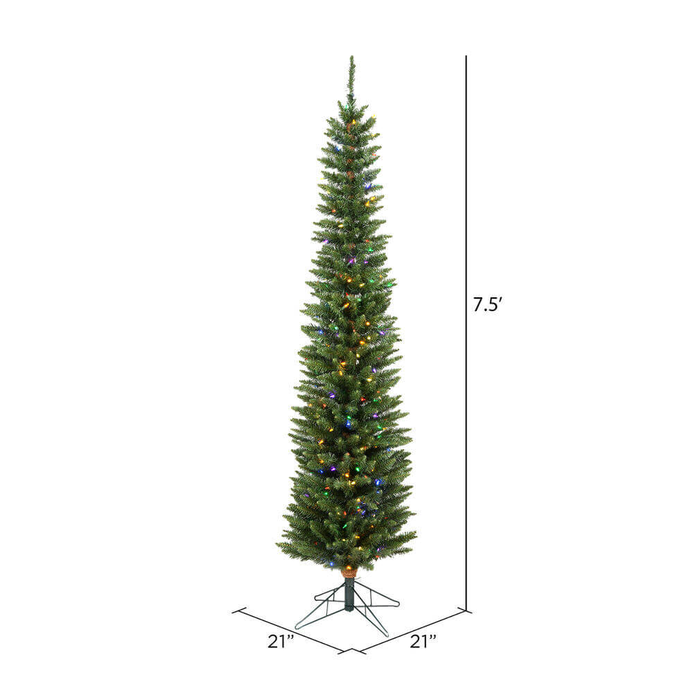 Bring vibrant holiday color to your home with the Vickerman 7.5' Durham Pole Pine Artificial Christmas Tree (Model A103677LED). Standing 7.5'feet tall with a 23-inch width, this tree features 499 lush green PVC branch tips for a realistic, full profile. Pre-lit with 250 multi-colored Italian Dura-Lit LED mini lights, it provides dynamic, festive illumination and is easy to control via the On/Off Step Switch. The metal hinged branches allow for quick setup and convenient storage, while the sturdy metal stand ensures reliable support. Perfect for adding color and cheer to your seasonal decor.