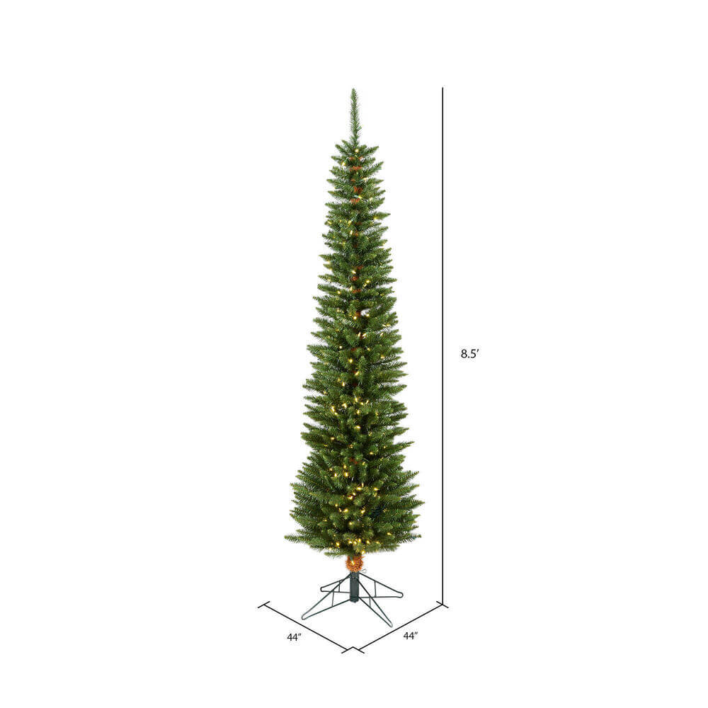 Bring elegance and warmth to your holiday decor with the Vickerman 8.5' Durham Pole Pine Artificial Christmas Tree (Model A103681LED). Standing 8.5'feet tall with a 28-inch width, this tree features 787 lush green PVC branch tips for a realistic, full appearance. Pre-lit with 400 warm white Italian Dura-Lit LED mini lights, the tree comes with an On/Off Step Switch for convenient lighting control. The metal hinged branch design ensures fast assembly and easy storage, while the sturdy metal stand provides reliable support. This durable tree combines timeless beauty and energy-efficient lighting for your seasonal celebrations.