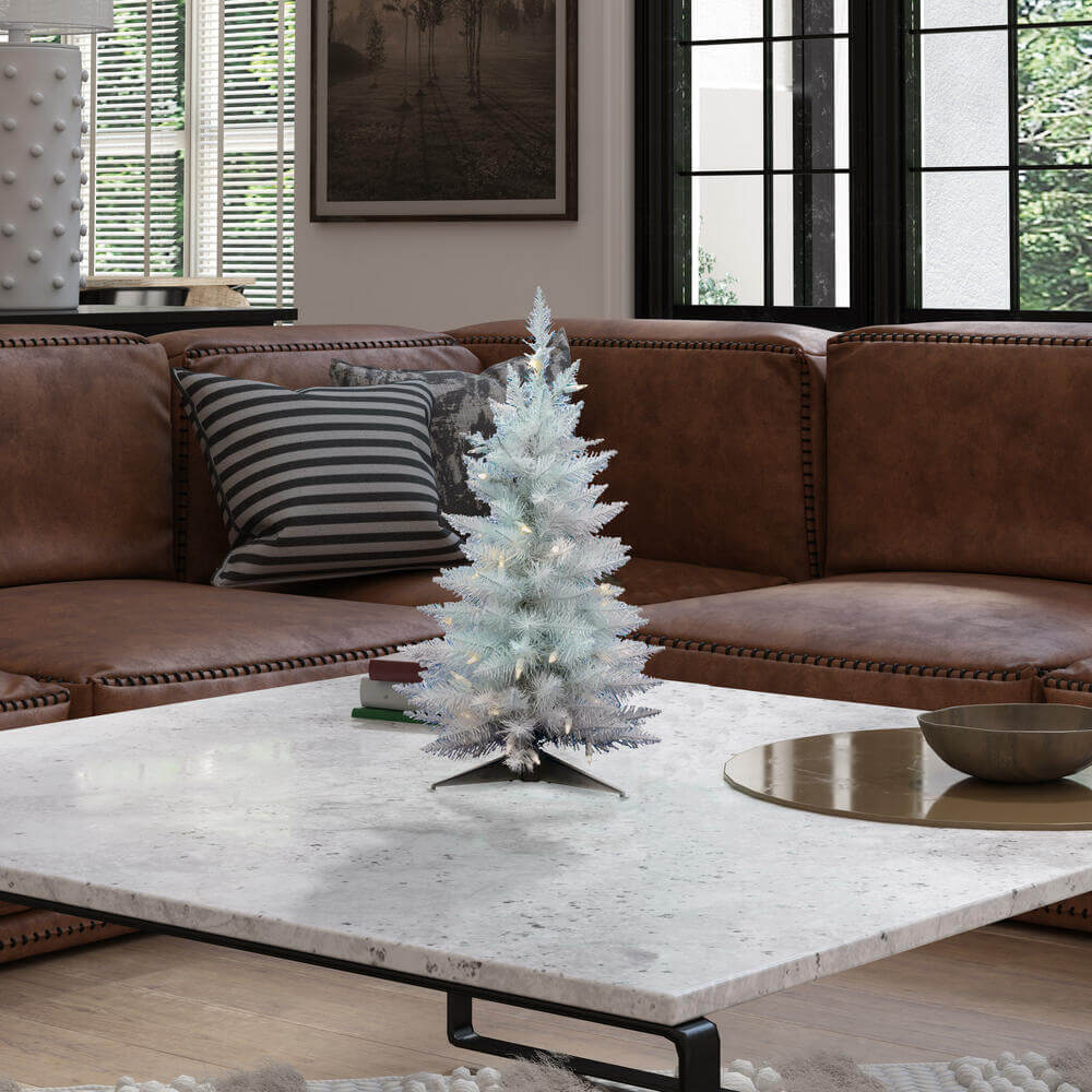 Brighten small spaces with the Vickerman 30" Sparkle White Spruce Pencil Artificial Christmas Tree (Model A104031LED). This compact tree features 100 PVC tips and comes pre-lit with 50 Warm White Single Mold LED Italian Mini Lights, providing soft, long-lasting illumination. Its pull-down branches allow for easy assembly and storage, while the plastic tree stand ensures stability. Perfect for tabletop or small-area holiday decor, this tree adds charm, convenience, and festive light to any setting.