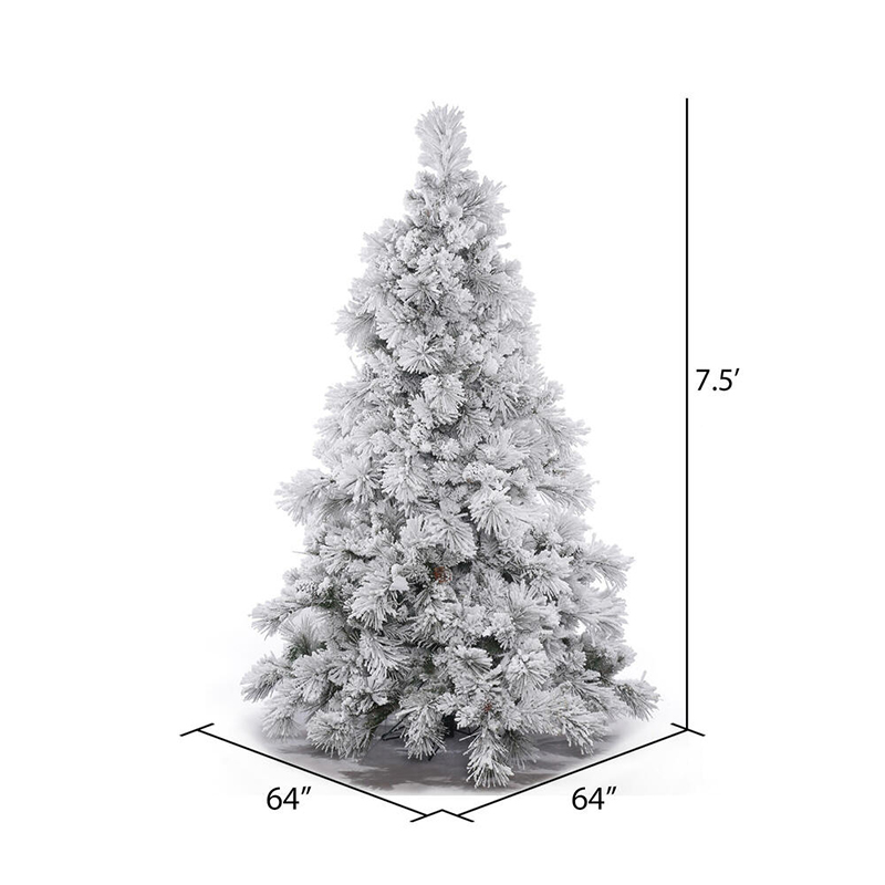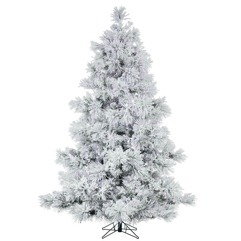 Vickerman Artificial 7.5' x 64" Flocked Alberta Christmas tree featuring 1066 PVC tips, pine cones, and 650 Warm White Italian LED lights. This tree features beautifully flocked tips on metal hinged branches, pine cone accents, energy efficient Led lights, an On/Off Switch Step, and A folding metal tree stand is included.
