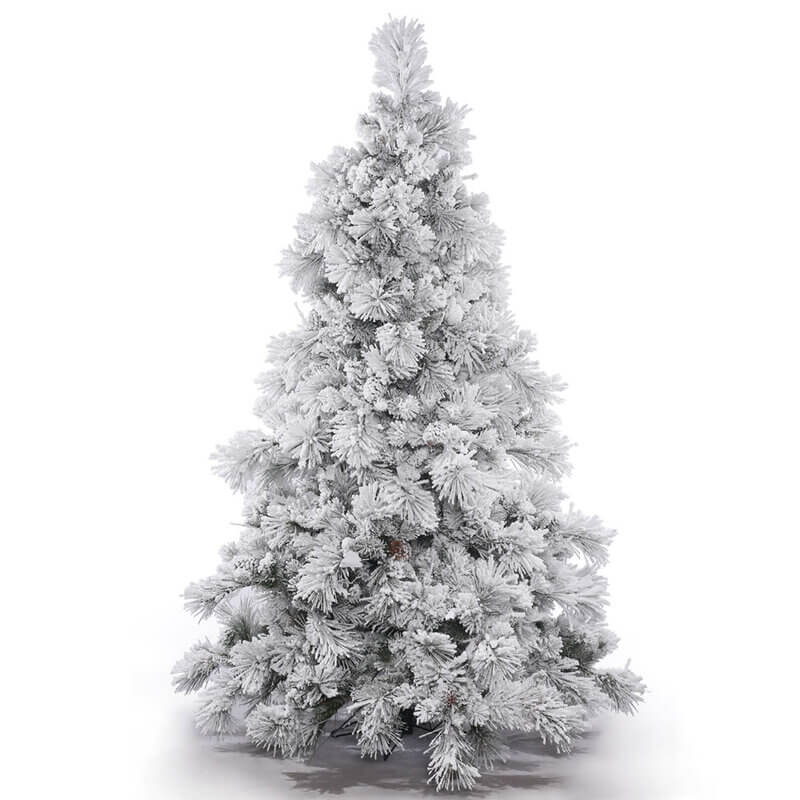 Vickerman Artificial 7.5' x 64" unlit Flocked Alberta Christmas tree featuring 1066 PVC tips and pine cones. This tree comes unlit, features beautifully flocked tips on metal hinged branches, pine cone accents, and a Metal tree stand is included.