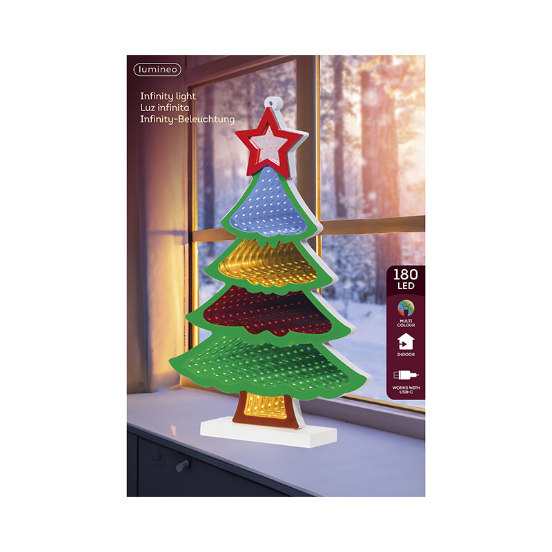 Bring a festive glow and modern magic to your Christmas décor with this Christmas Tree with Star LED Infinity Light. Featuring 180 LEDs, this dazzling decoration combines color and depth through an infinity mirror design that gives the illusion of endless light.