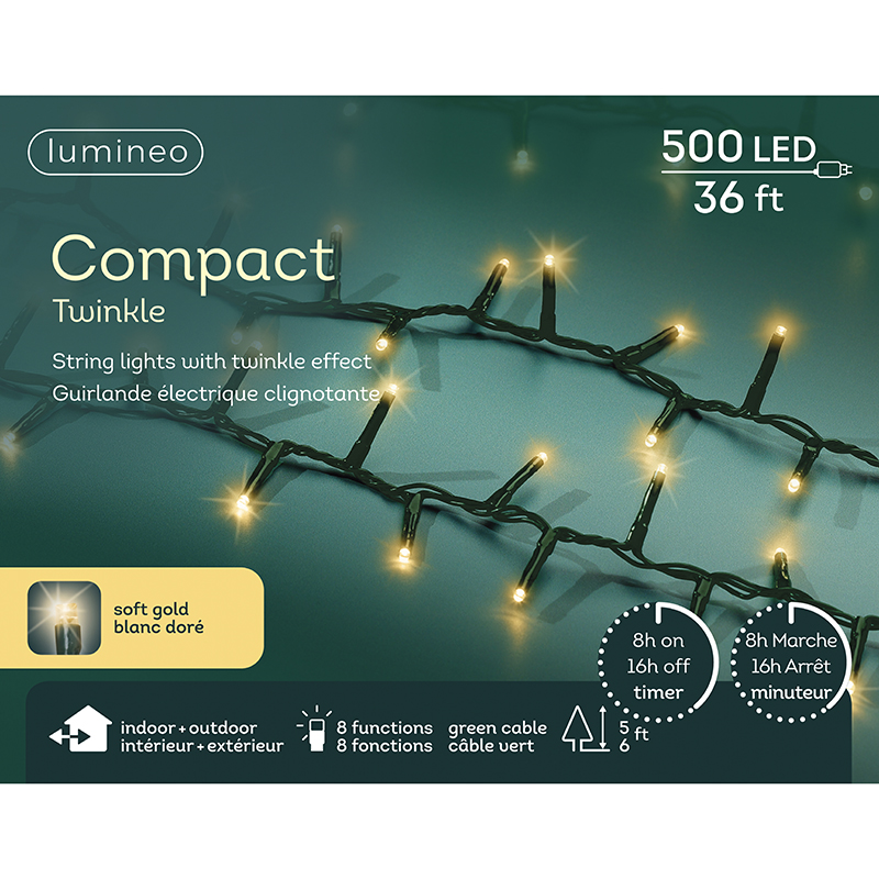 These enchanting lights stretch an impressive 36 ft., providing stellar coverage whether decorating a Christmas tree or illuminating your backyard. Enjoy eight delightful twinkle effect functions to enhance the seasonal ambiance. The convenient transformer power type eliminates battery hassles, and the included timer ensures the lights operate just as you desire, with an 8-hour illumination cycle. Designed with the festivities in mind, the Lumineo Tree Lights Compact Soft Gold set creates a warm and inviting atmosphere perfect for celebrating the holidays in sparkling style.