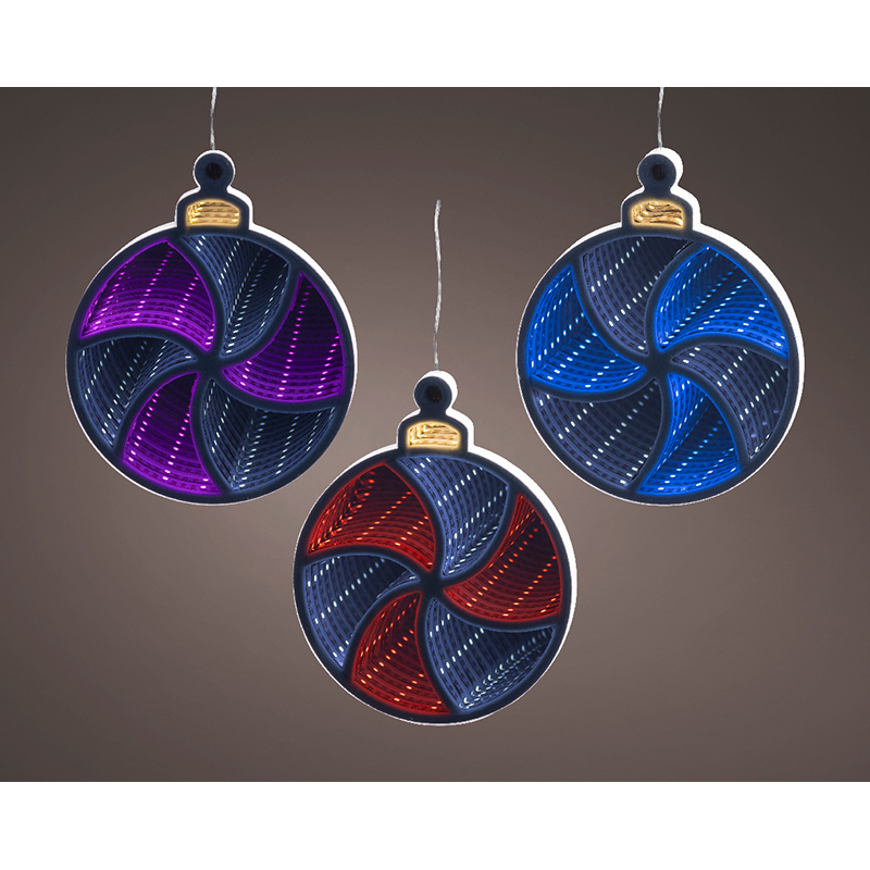 Add vivid hues and glowing depth to your décor with this 3-Pack Hanging Infinity LED Ornaments (Red, Blue, Purple). Each ornament stands 6″ tall and incorporates an infinity mirror LED effect that creates a multi-dimensional glow. These are powered by 3 AA batteries (not included) for cordless placement and easy display. Hang them in windows, over dining areas, entryways, or layered décor settings to bring a colorful, luminous accent to your holiday or seasonal arrangement.