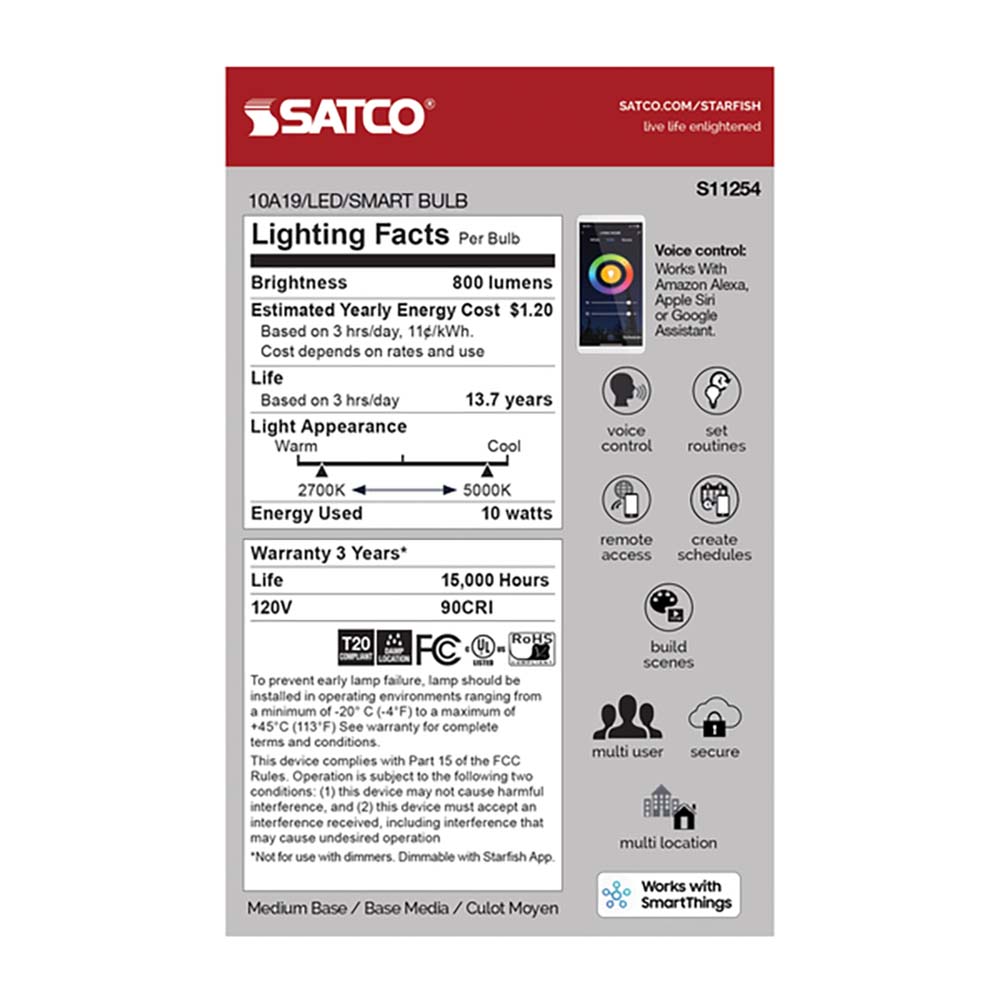 Integrated Starfish IOT compatibility provides smart control functionality, enabling adjustments to brightness, color temperature, and color scenes through connected systems. Perfect for living rooms, bedrooms, kitchens, offices, restaurants, and hospitality settings, this 10 Watt LED bulb supports both functional illumination and decorative lighting effects. Engineered for long-lasting performance and reduced energy consumption compared to traditional incandescent lamps, it delivers dependable, customizable lighting in a familiar A19 shape. Whether enhancing everyday comfort or adding vibrant color to your space, this RGB and tunable white LED lamp offers flexible performance with modern smart technology.