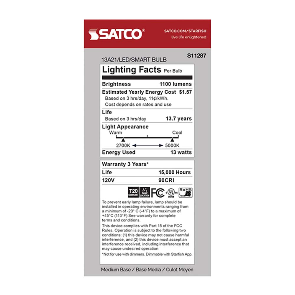 With integrated Starfish IOT compatibility, you can control brightness, color temperature, and dynamic color scenes through connected smart systems. The 13 Watt energy-efficient design reduces power consumption while offering long-lasting performance compared to traditional incandescent lamps. Ideal for living rooms, bedrooms, kitchens, offices, retail spaces, and hospitality settings, this versatile A21 LED provides dependable illumination with modern smart convenience. Whether for daily comfort lighting or creative color displays, this RGB and tunable white lamp delivers reliable performance and broad coverage.